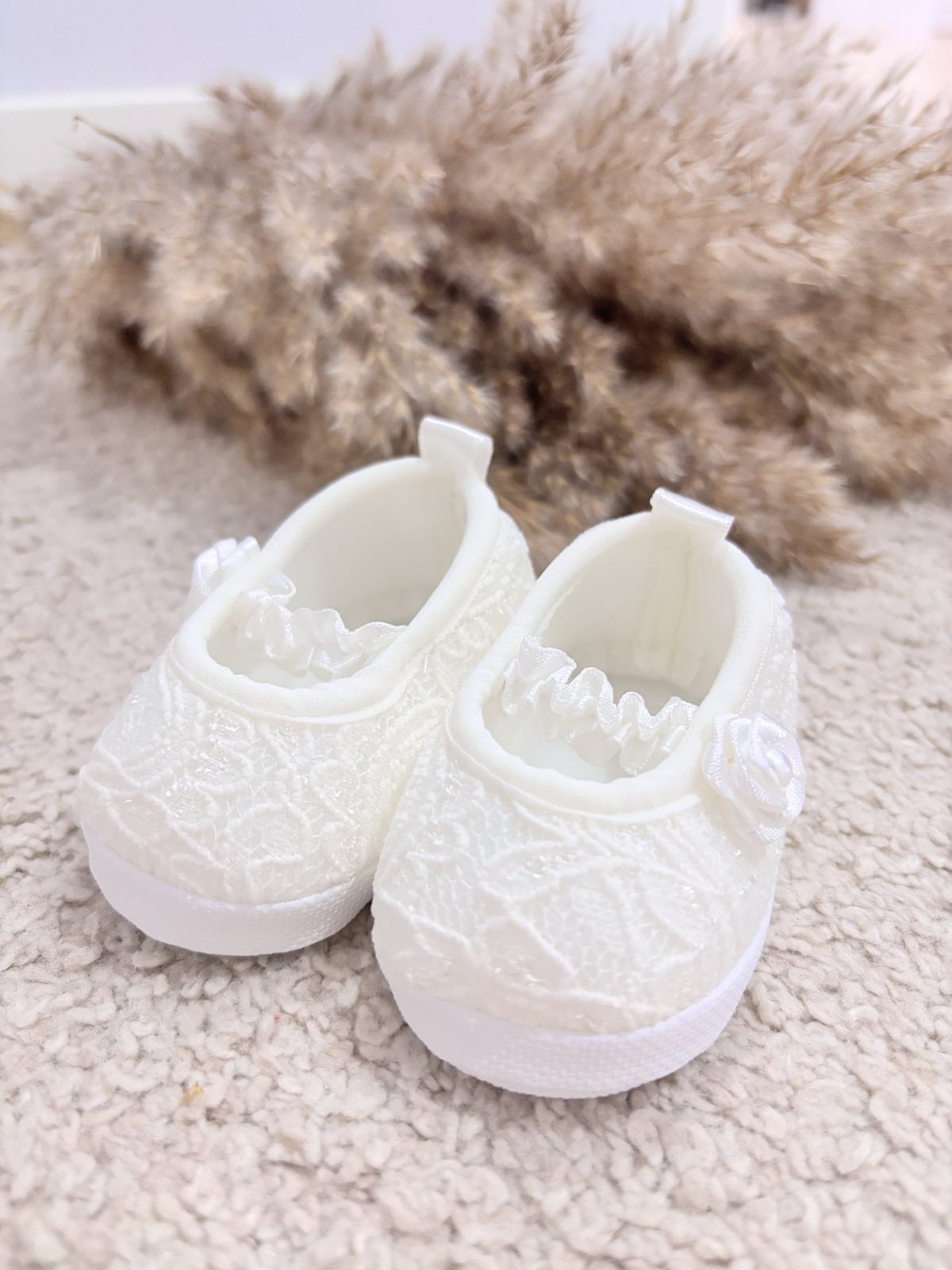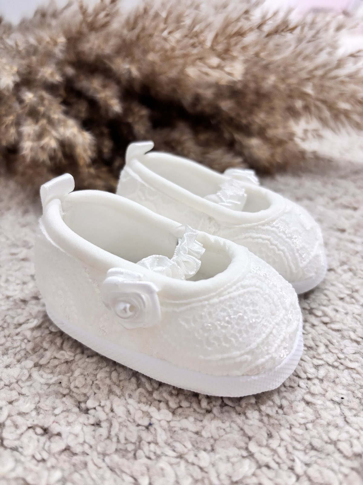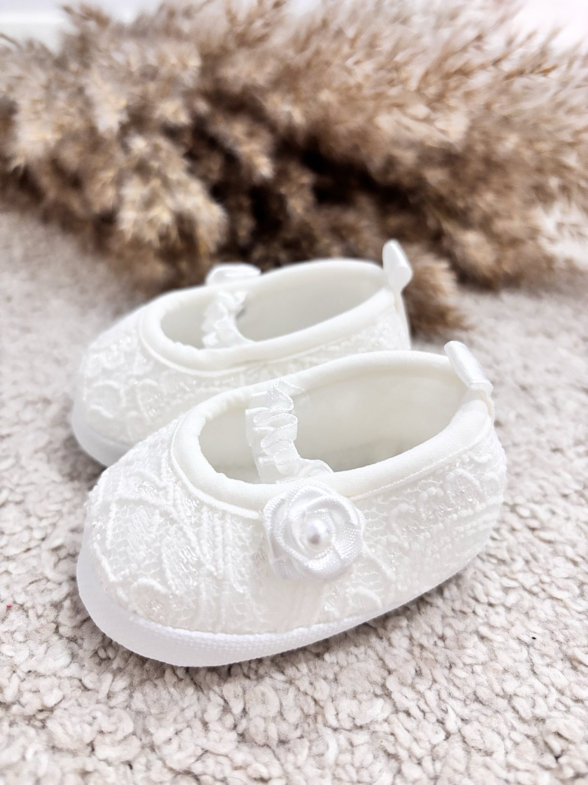 Koronkowe buciki do chrztu z różyczką. Buciki niemowlęce w kolorze złamanej bieli uszyte z delikatnej koronki zdobione różyczką. Baletki idealne do chrztu oraz wyjątkowe uroczystości. Bardzo lekkie, miękkie i wygodne buciki do chrztu dodadzą elegancji każdej stylizacji dla małej damy. Produkt Polski.