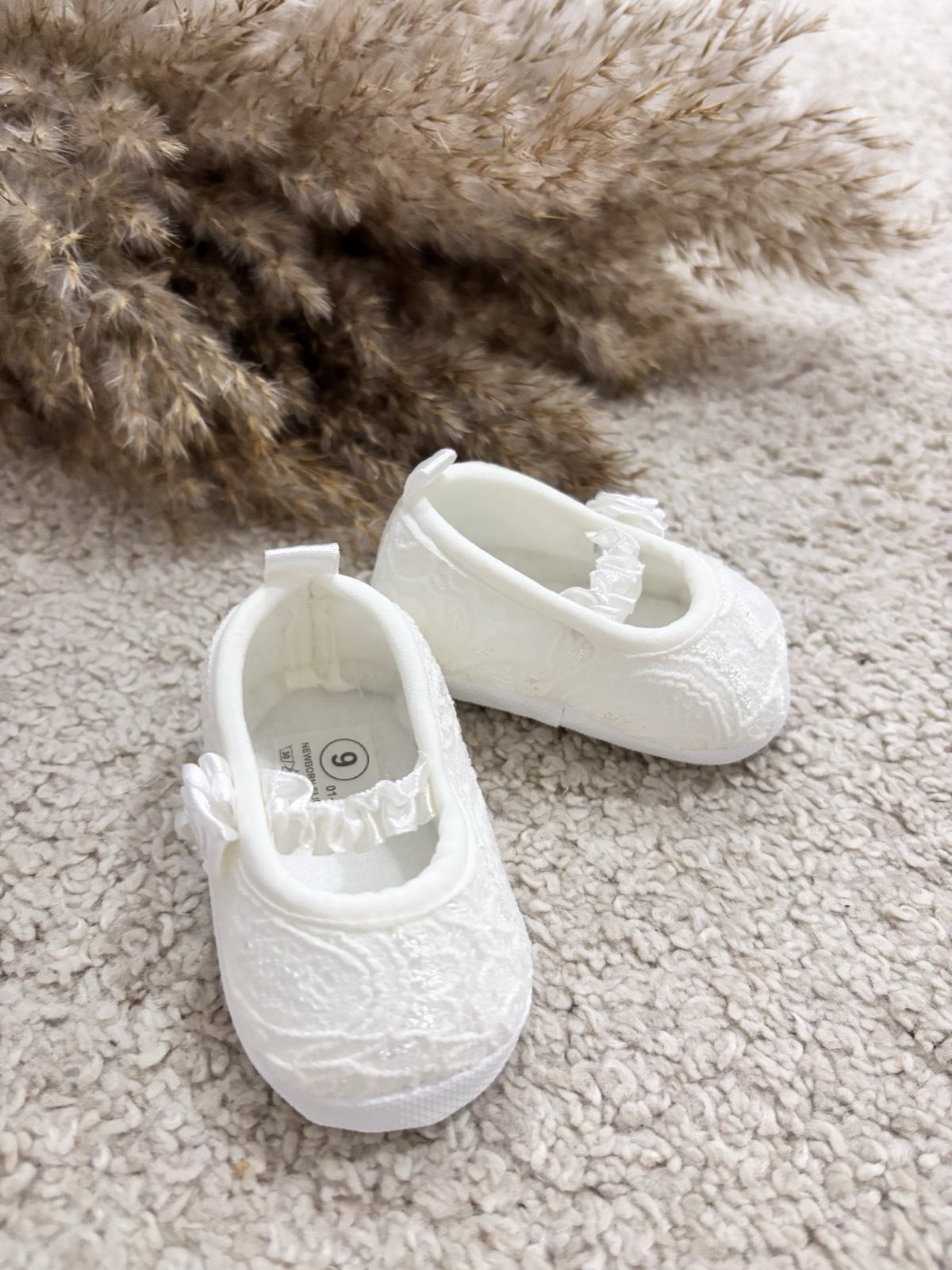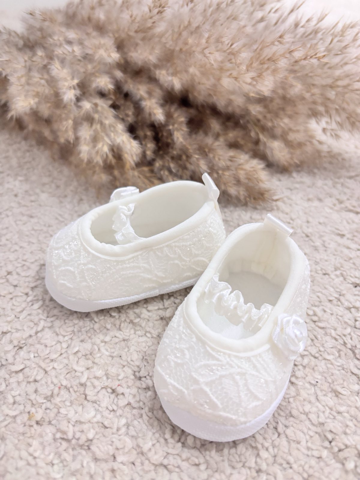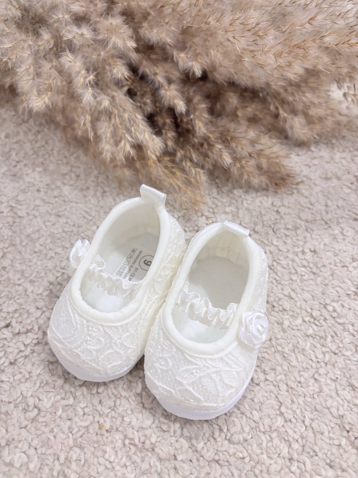 Koronkowe buciki do chrztu z różyczką. Buciki niemowlęce w kolorze złamanej bieli uszyte z delikatnej koronki zdobione różyczką. Baletki idealne do chrztu oraz wyjątkowe uroczystości. Bardzo lekkie, miękkie i wygodne buciki do chrztu dodadzą elegancji każdej stylizacji dla małej damy. Produkt Polski.