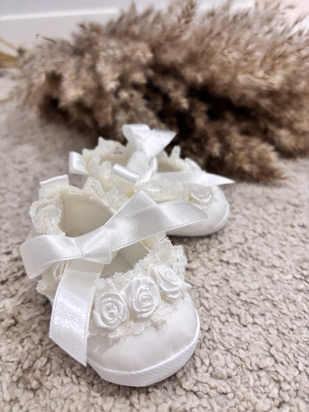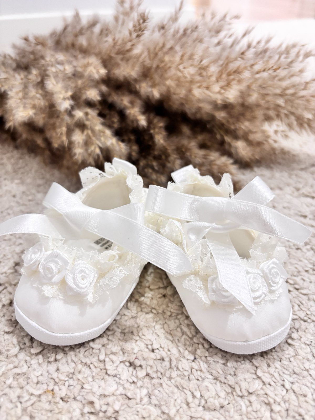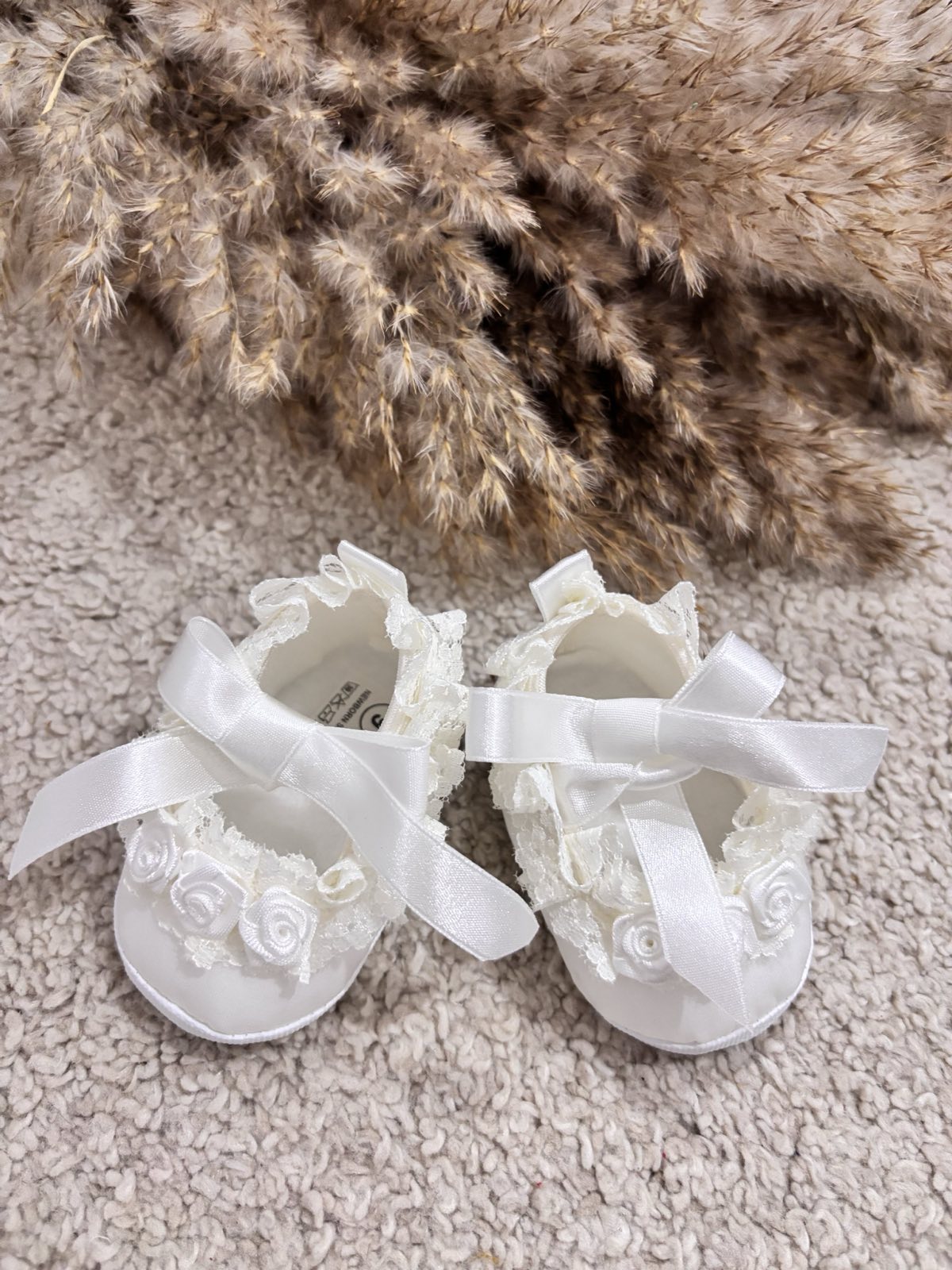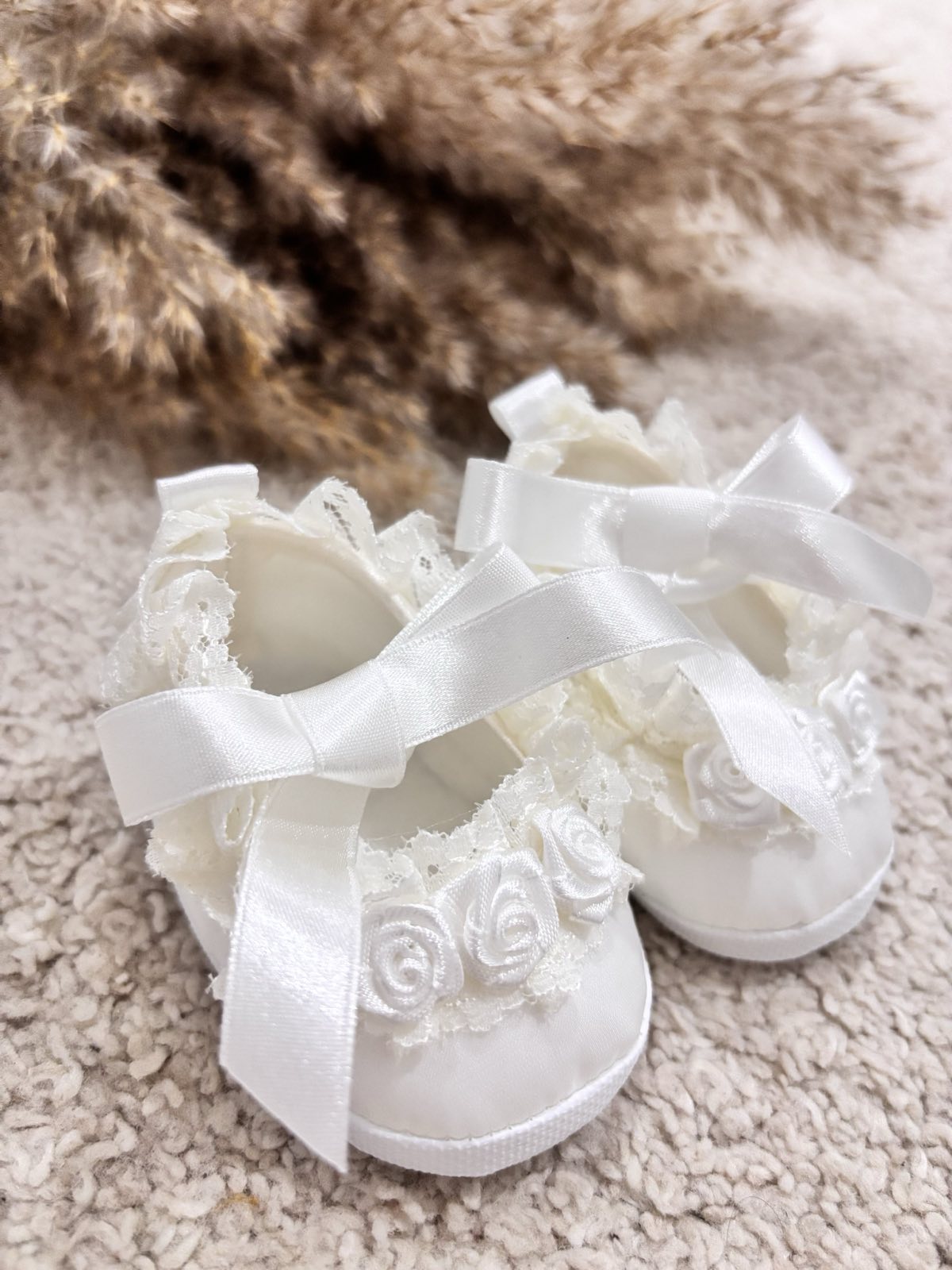 Satynowe buciki do chrztu z różyczkami wiązane na kokardkę . Urocze buciki niemowlęce w kolorze złamanej bieli uszyte z eleganckiej satyny zdobione różyczkami oraz kokardką. Baletki doskonałe do chrztu oraz wyjątkowe uroczystości. Bardzo lekkie, miękkie i wygodne buciki do chrztu dodadzą elegancji każdej stylizacji dla małej damy. Produkt Polski.