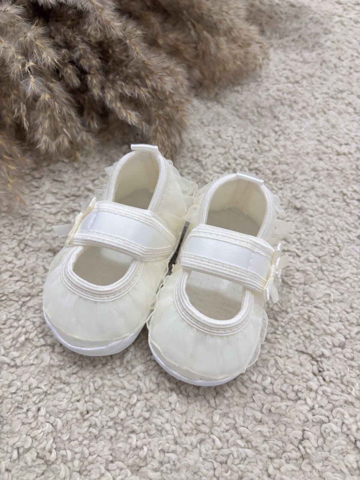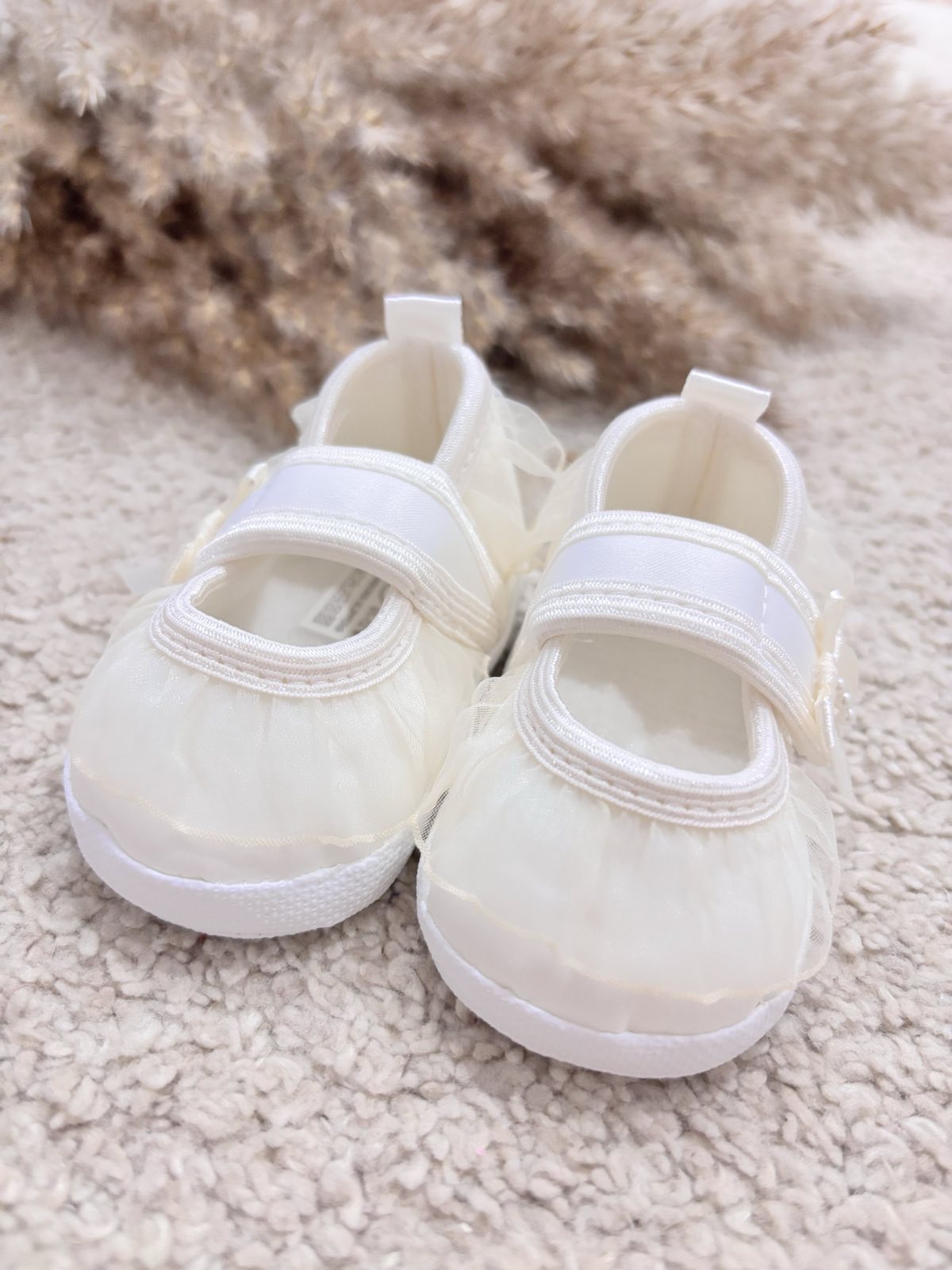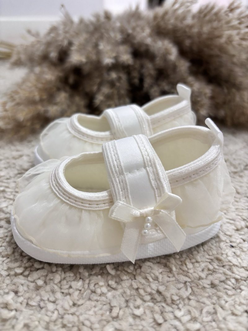 Satynowe buciki do chrztu z tiulową falbanką. Buciki niemowlęce w pięknym śmietankowym odcieniu uszyte z eleganckiej satyny zdobione tiulową falbanką. Buciki zapinane są na rzep – bardzo wygodne dla maluszka. Pantofelki do chrztu oraz wyjątkowe uroczystości. Bardzo lekkie i miękkie buciki do chrztu dodadzą elegancji każdej stylizacji dla małej damy. Produkt Polski.