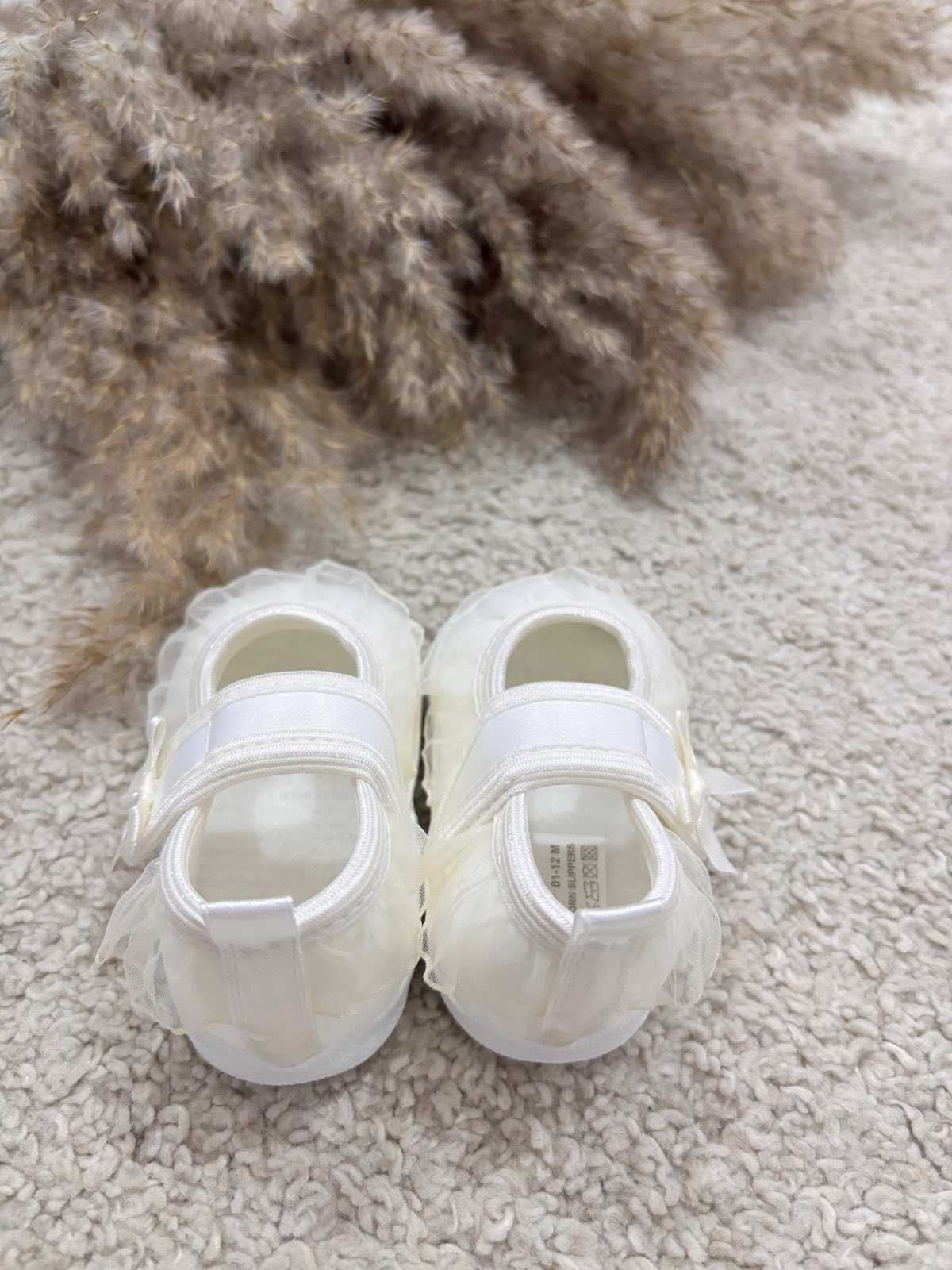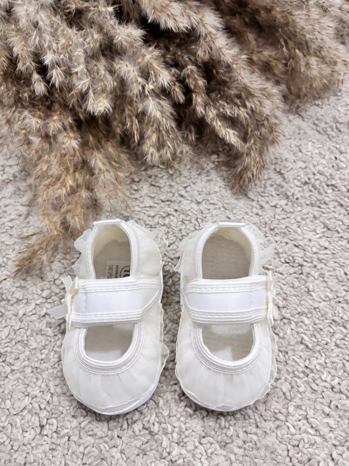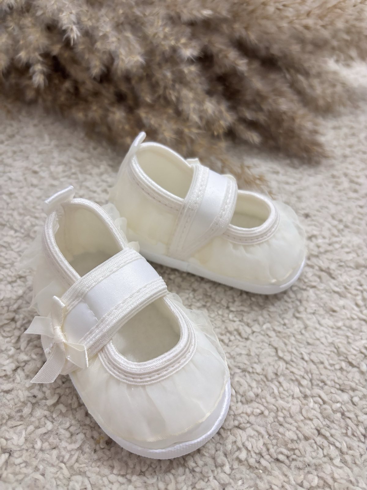 Satynowe buciki do chrztu z tiulową falbanką. Buciki niemowlęce w pięknym śmietankowym odcieniu uszyte z eleganckiej satyny zdobione tiulową falbanką. Buciki zapinane są na rzep – bardzo wygodne dla maluszka. Pantofelki do chrztu oraz wyjątkowe uroczystości. Bardzo lekkie i miękkie buciki do chrztu dodadzą elegancji każdej stylizacji dla małej damy. Produkt Polski.