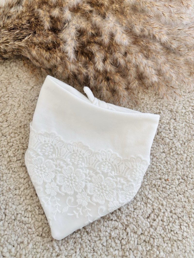 Elegancka chustka do chrztu z tiulową koronką. Bandana niemowlęca została uszyta z bawełnianej dzianiny w kolorze śmietankowym. Z tyłu chustka jest wiązana. Podwójna warstwa materiału sprawia, że chustka będzie doskonałym uzupełnieniem stylizacji do chrztu w chłodniejsze dni. Do bandany została doszyta urocza koronka, dzięki czemu chustka jest elegancka i uroczysta. Chustkę możesz zestawić z naszą dowolną sukienką, turbanem oraz opaską – dzięki czemu stworzysz piękny i elegancki zestaw dla maluszka w tym wyjątkowym dniu jakim jest chrzest.