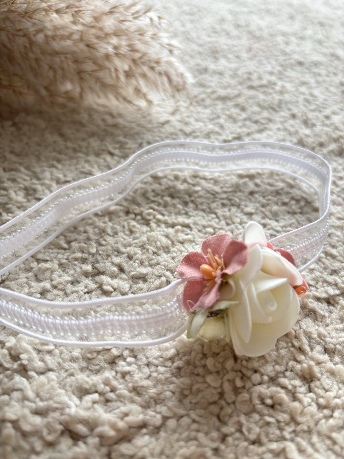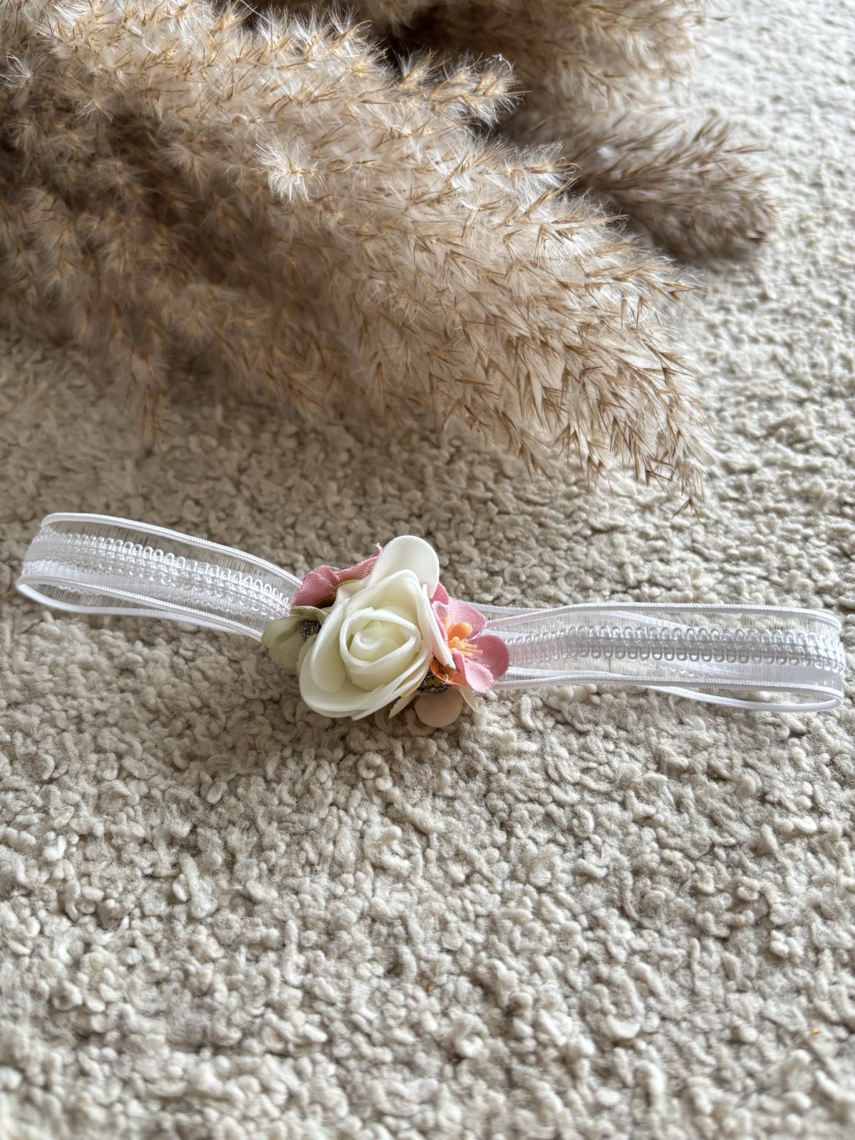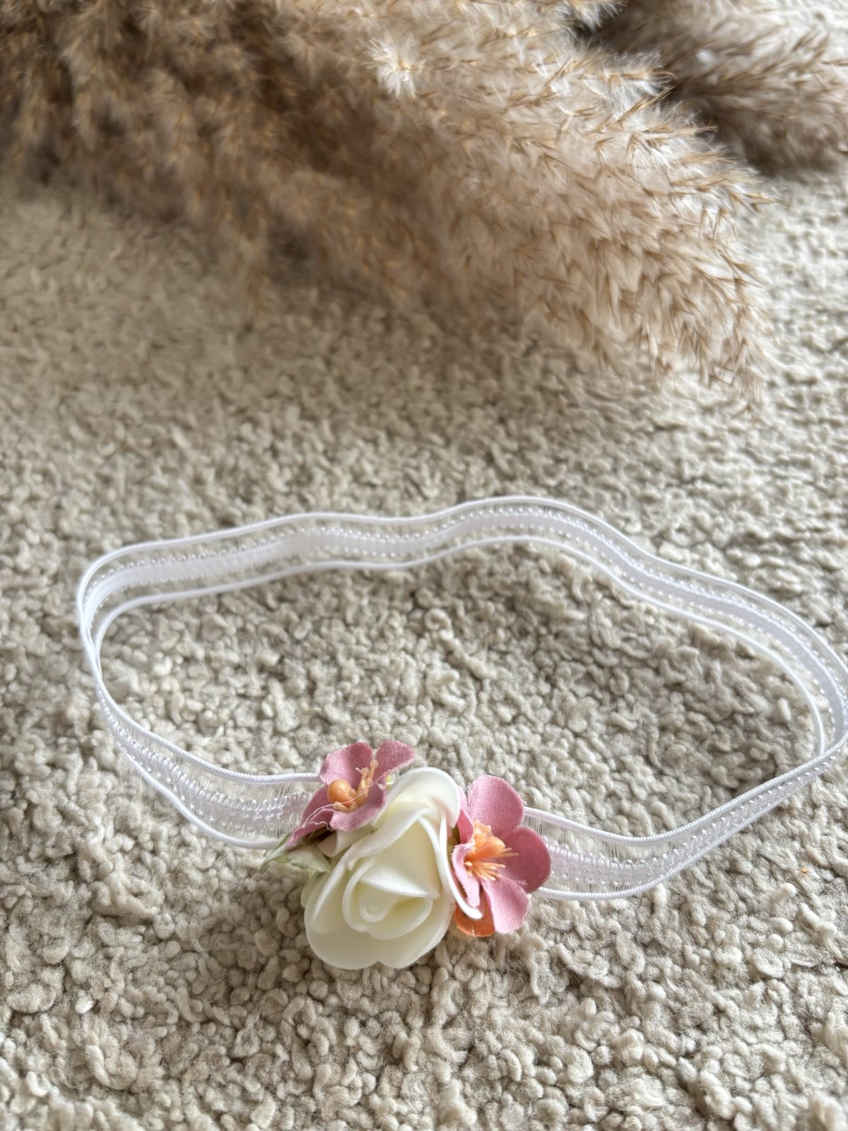 Delikatna i elegancka opaska do chrztu z kwiatkiem. Opaska niemowlęca z odcieniu śmietankowym wykonana z elastycznej tiulowej koronki, zdobiona różanym bukiecikiem. Opaska dostępna w trzech rozmiarach – pasuje na dziewczynki 0 – 12 miesięcy. Koronkowa Opaska będzie idealnym uzupełnieniem sukienki do chrztu oraz inne uroczystości rodzinne. Produkt Polski