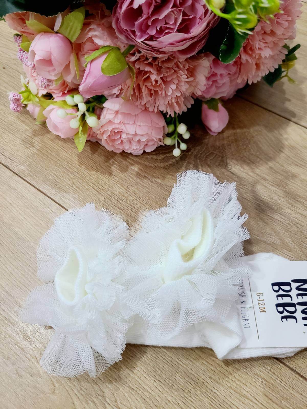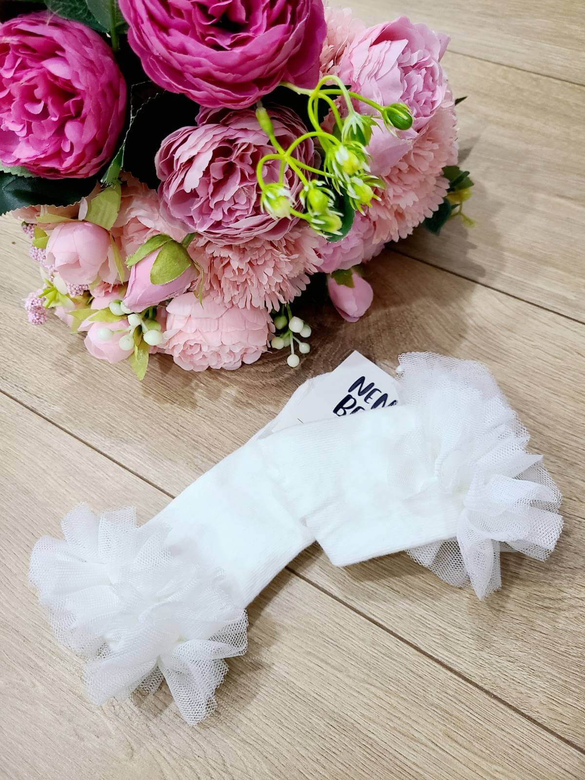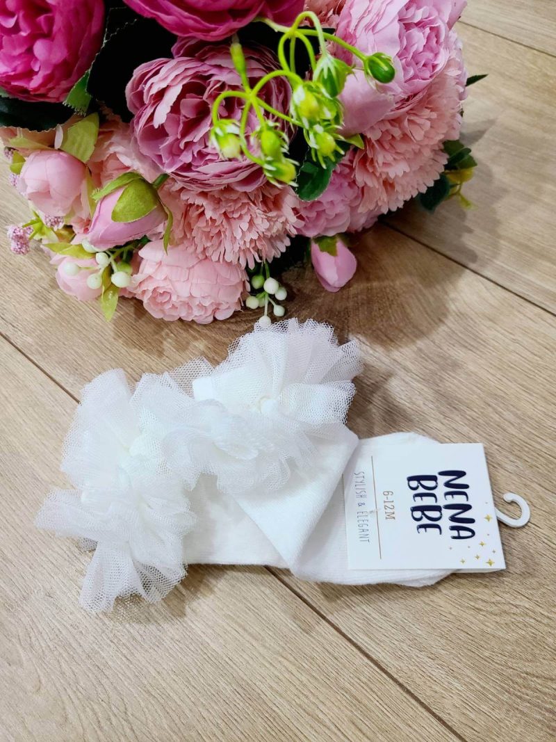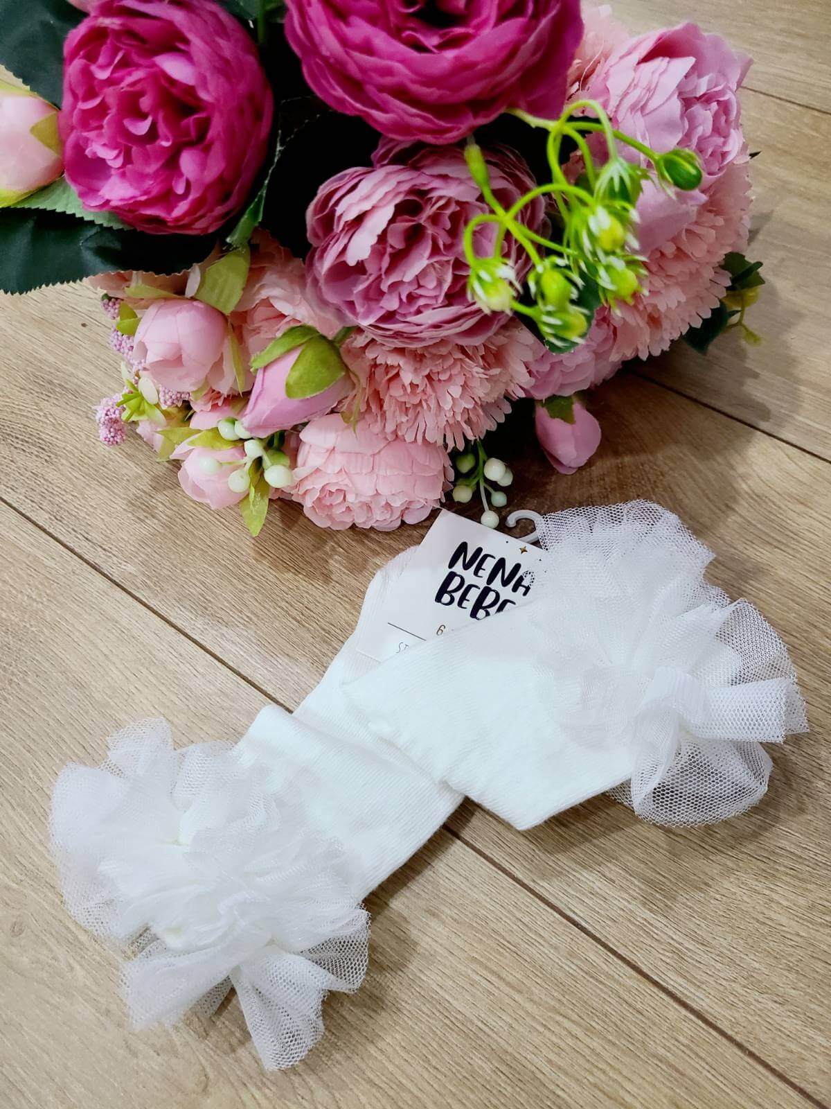 Eleganckie podkolanówki do chrztu z tiulową falbanką. Skarpetki doskonale uzupełnią kreację do chrztu Twojego maluszka. Do wyboru rozmiary 0-6 miesięcy lub 6-12 miesięcy. Podkolanówki są bardzo wygodne i jednocześnie eleganckie, dzięki czemu będą idealnym wyborem w tym ważnym dniu, jakim jest Chrzest Święty.