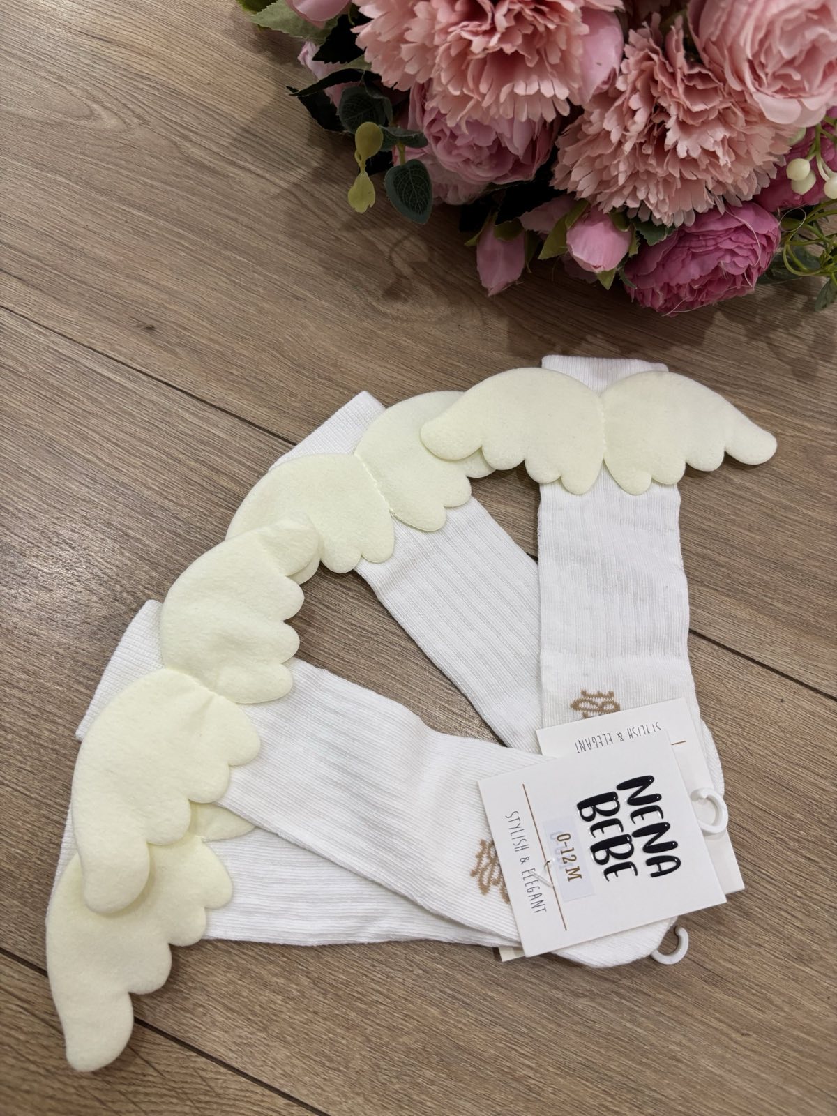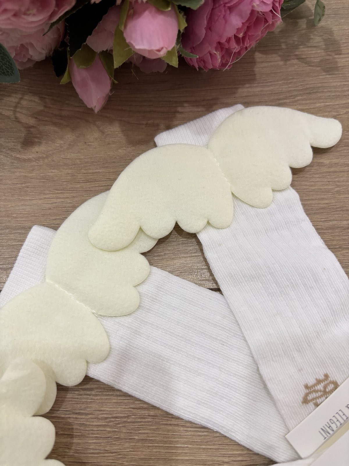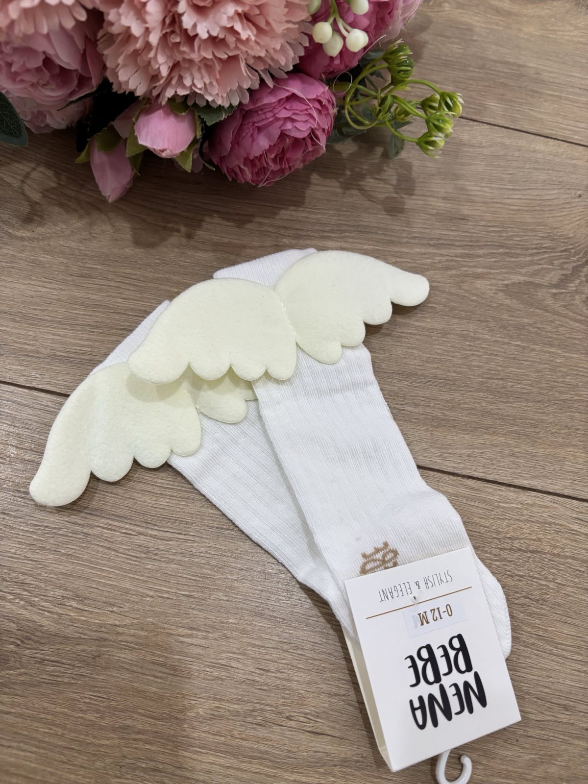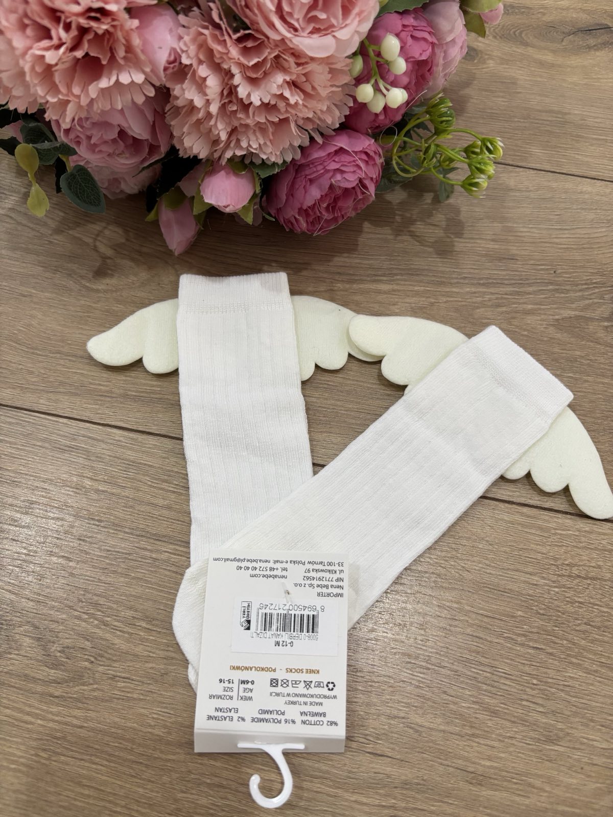 Niemowlęce podkolanówki do chrztu ze skrzydełkami. Podkolanówki doskonale uzupełnią kreację do chrztu Twojego maluszka. Kolor śmietankowy z kremowymi skrzydełkami. Podkolanówki są bardzo wygodne i jednocześnie eleganckie, dzięki czemu będą idealnym wyborem w tym ważnym dniu, jakim jest Chrzest Święty. Rozmiar uniwersalny 0-12 miesięcy.