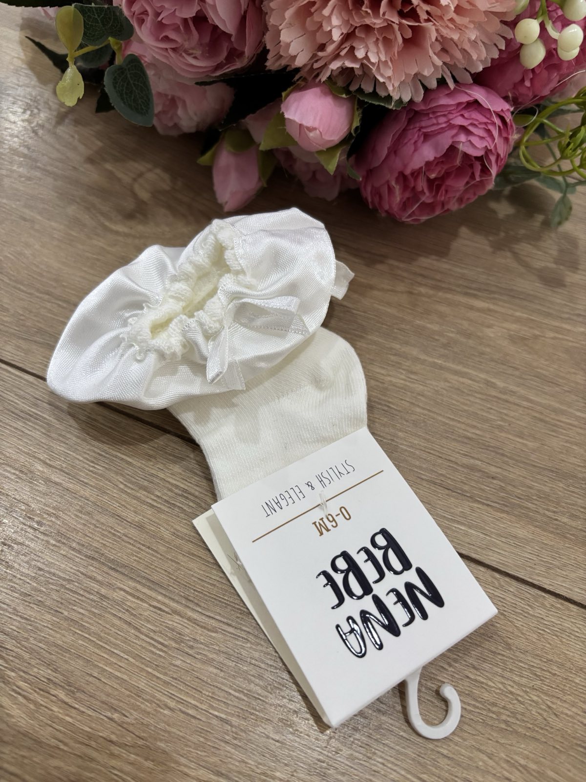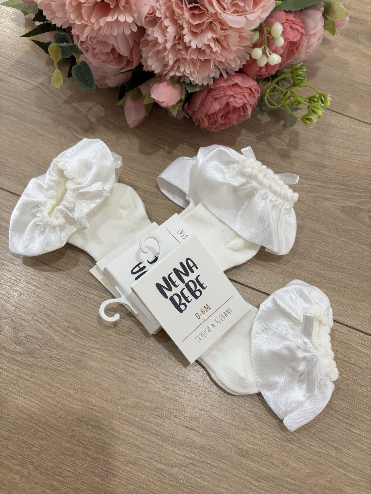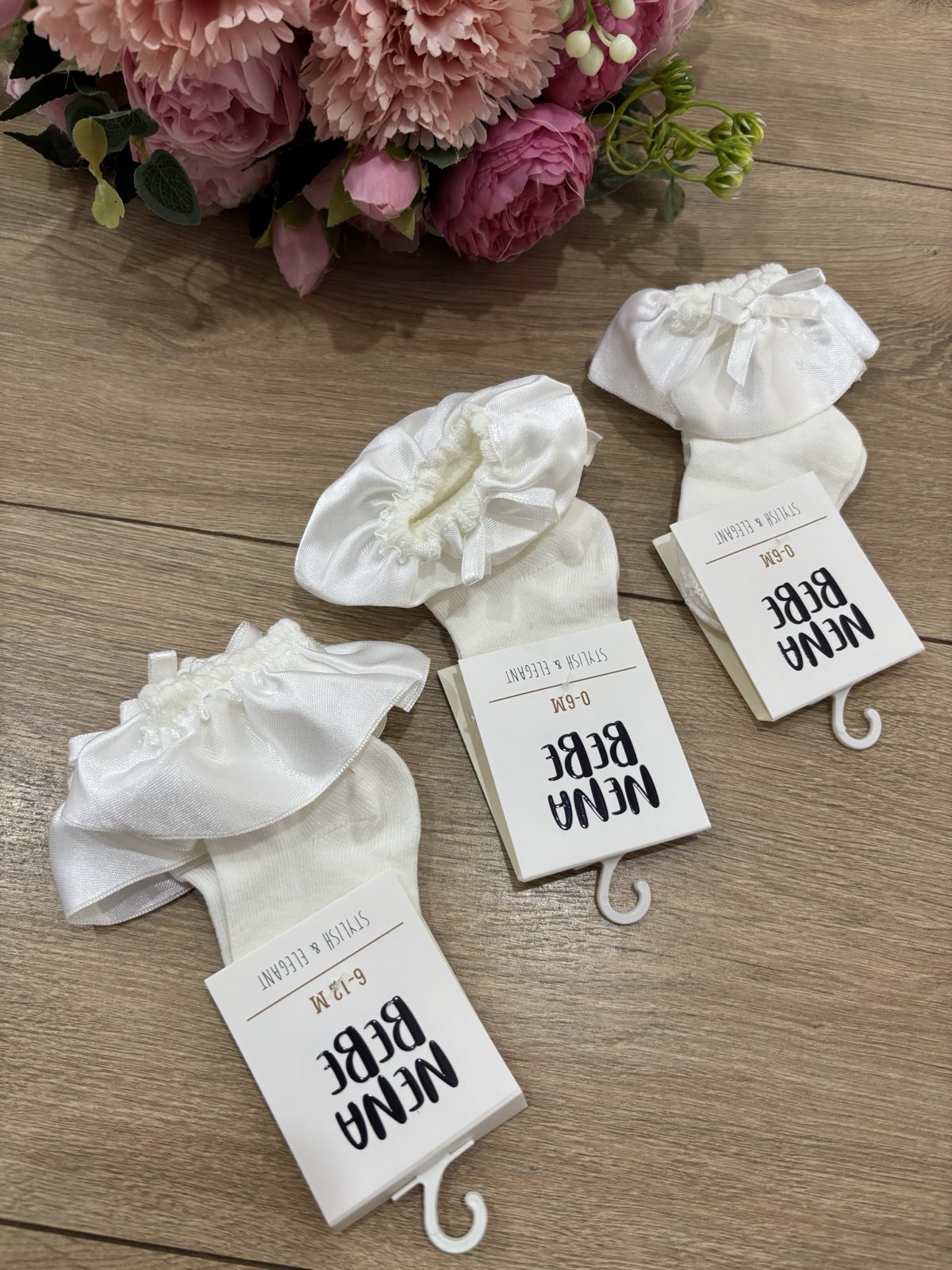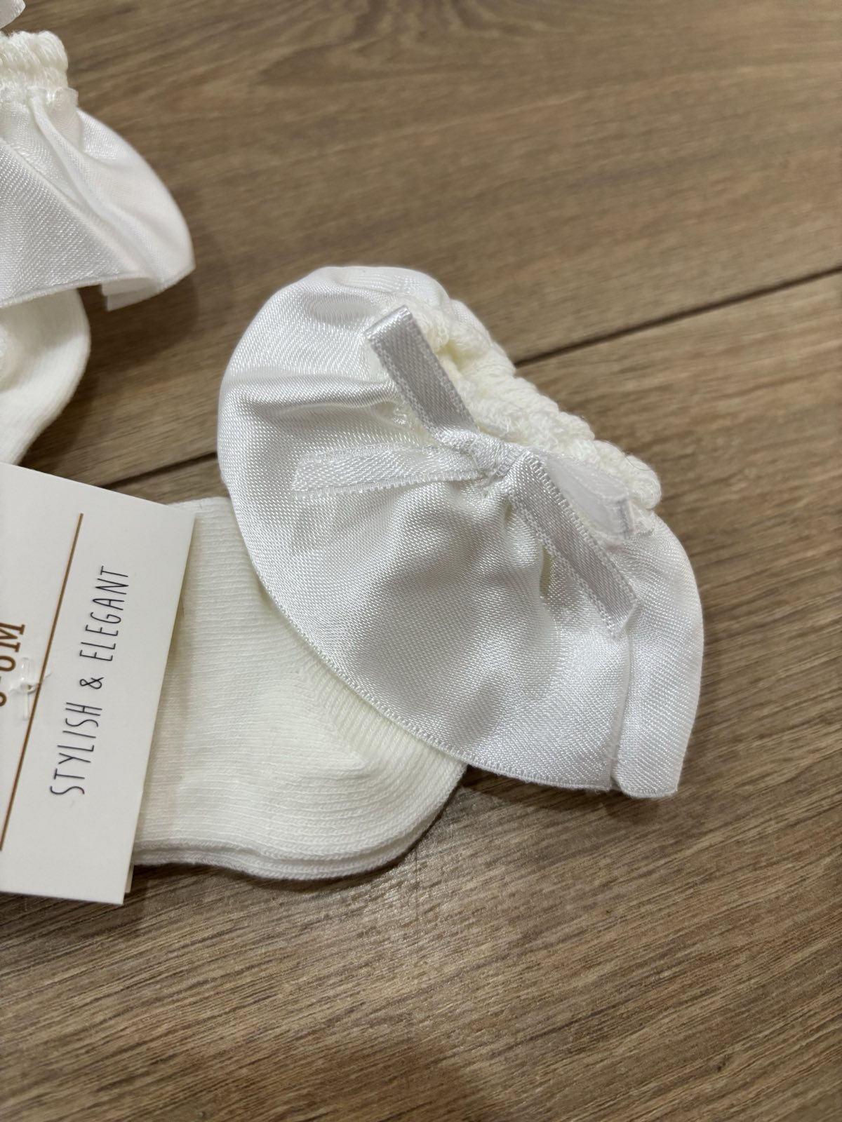 Urocze i eleganckie skarpetki do chrztu z satynową falbanką. Skarpetki niemowlęce doskonale uzupełnią kreację do chrztu Twojego maluszka. Do wyboru rozmiary 0-6 miesięcy lub 6-12 miesięcy. Skarpetki są bardzo wygodne i jednocześnie eleganckie, dzięki czemu będą idealnym wyborem w tym ważnym dniu, jakim jest Chrzest Święty. Kolor śmietankowy.