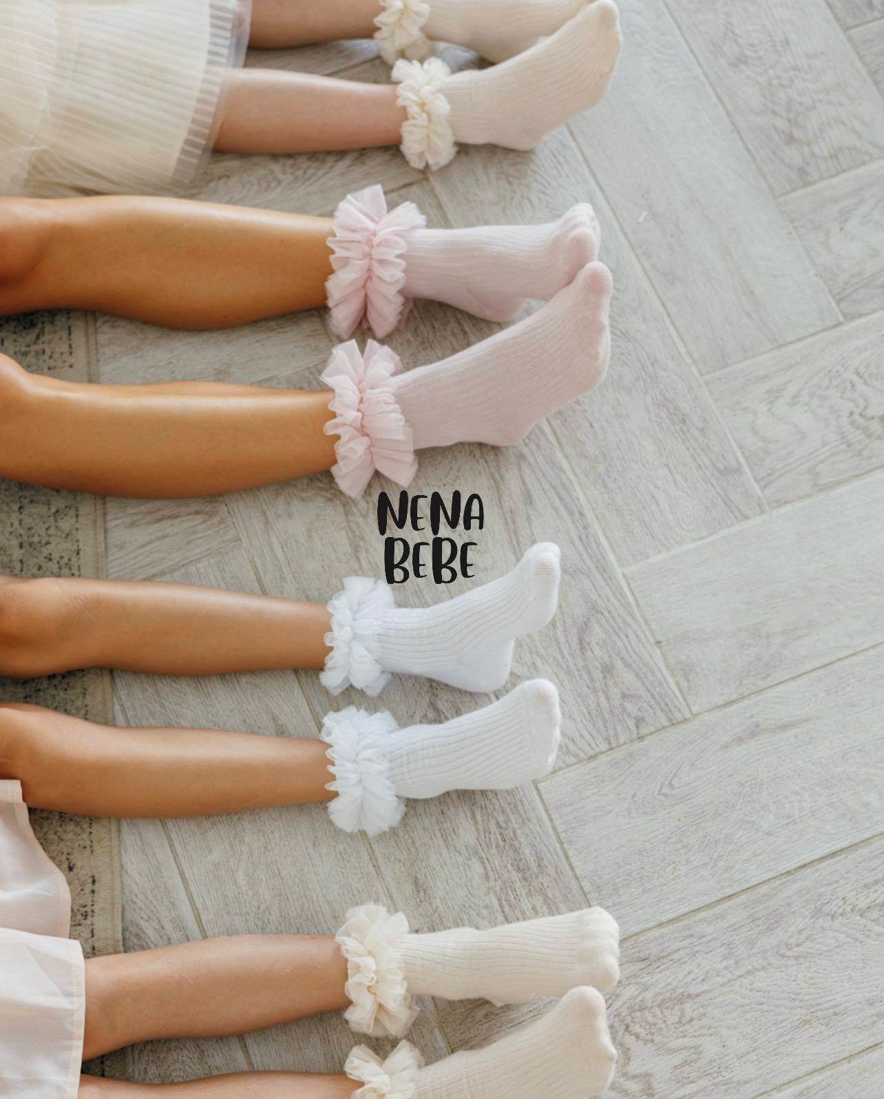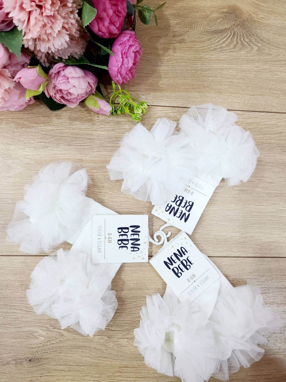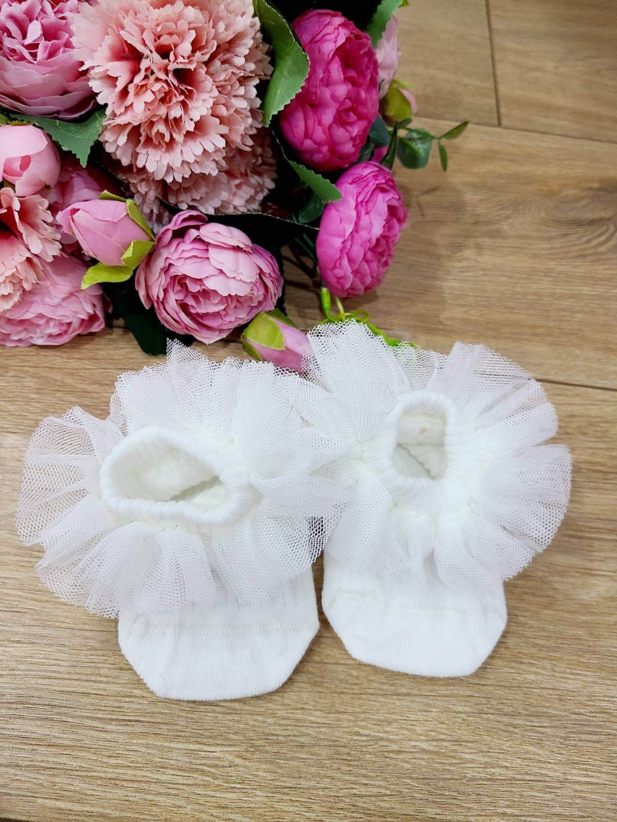Urocze i eleganckie skarpetki do chrztu z tiulową falbanką. Skarpetki doskonale uzupełnią kreację do chrztu Twojego maluszka. Do wyboru rozmiary 0-6 miesięcy lub 6-12 miesięcy. Skarpetki są bardzo wygodne i jednocześnie eleganckie, dzięki czemu będą idealnym wyborem w tym ważnym dniu, jakim jest Chrzest Święty.