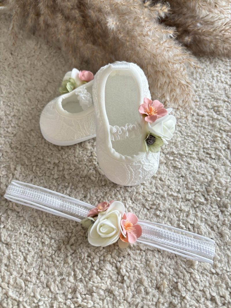 Zestaw do chrztu: Buciki do chrztu z różanym bukiecikiem + opaska. Buciki niemowlęce w kolorze śmietankowym uszyte z delikatnej koronki zdobione kolorową różyczką. Baletki idealne do chrztu oraz wyjątkowe uroczystości. Bardzo lekkie, miękkie i wygodne buciki do chrztu dodadzą elegancji każdej stylizacji dla małej damy. Opaska z delikatnej elastycznej koronki zdobiona różanym bukiecikiem Produkt Polski.