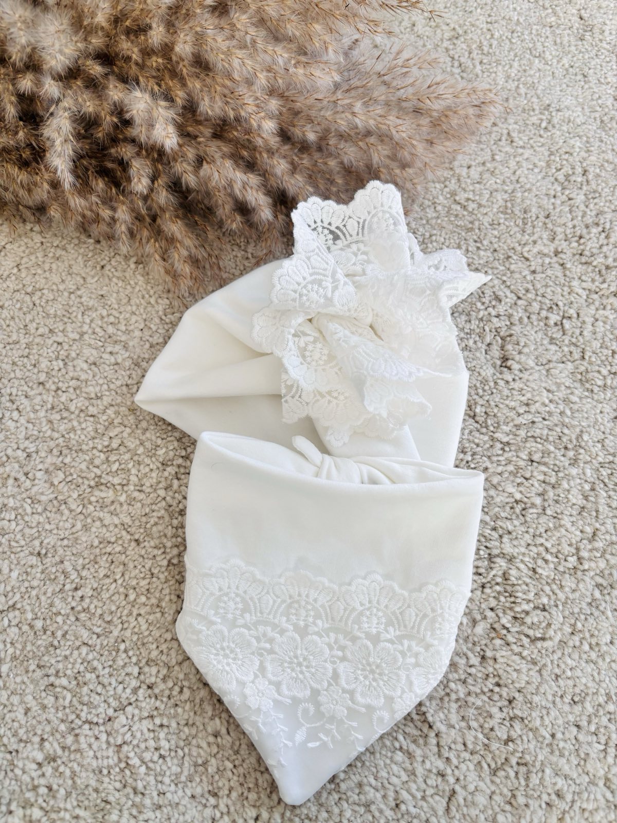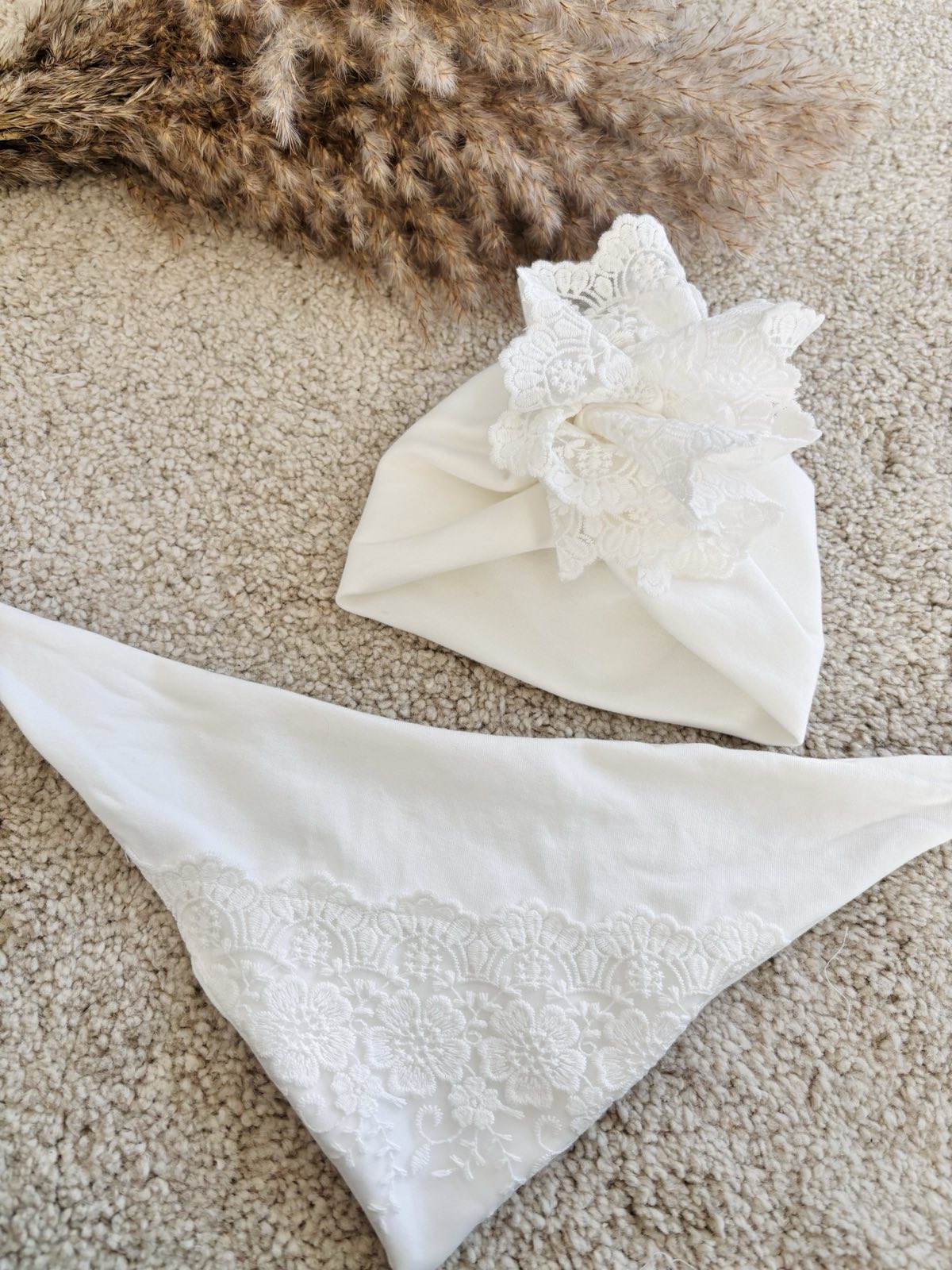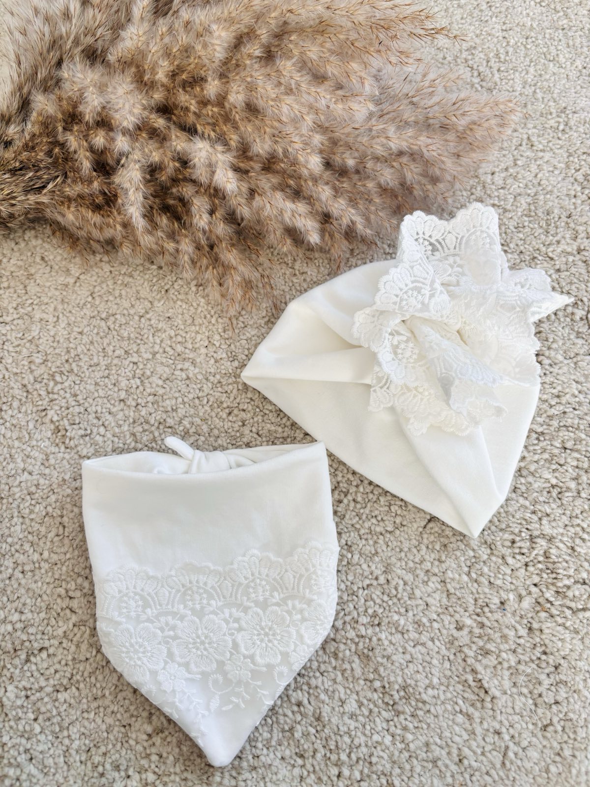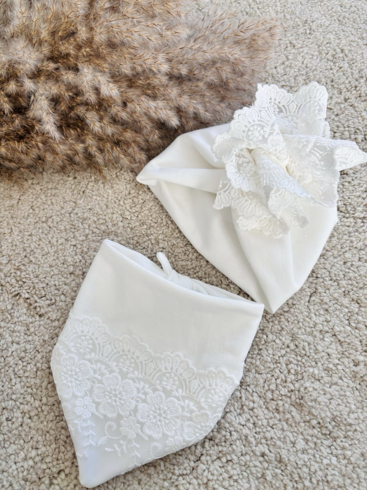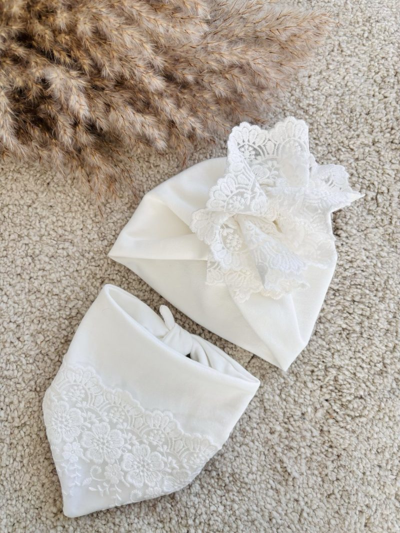 Zestaw na uroczystość chrztu – Dwuwarstwowy turban z chustą zdobiony elegancką tiulową koronką. Cały zestaw został uszyty z podwójnej warstwy dzianiny bawełnianej dresowej w kolorze śmietanki. Dzięki podwójnej warstwie będzie on doskonałym uzupełnieniem stylizacji do chrztu wczesną wiosną oraz jesienią. Turbanik jest bardzo miękki w dotyku, przyjemny i ciepły. Dodatek koronki, sprawia, że turban jest elegancki i doskonały na wyjątkowe uroczystości dla małej damy. Zestaw: Turban + chusta możesz zestawić z dowolną sukienką w naszym sklepie.